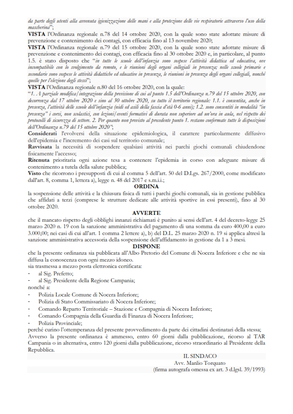 Gruppo Comunale Volontari Protezione Civile Città di Nocera Inferiore "G. Ferrara" Con l’Ordinanza Sindacale n. 44 del 18 Ottobre 2020 si dispone la chiusura dei Parchi Giochi Comunali.